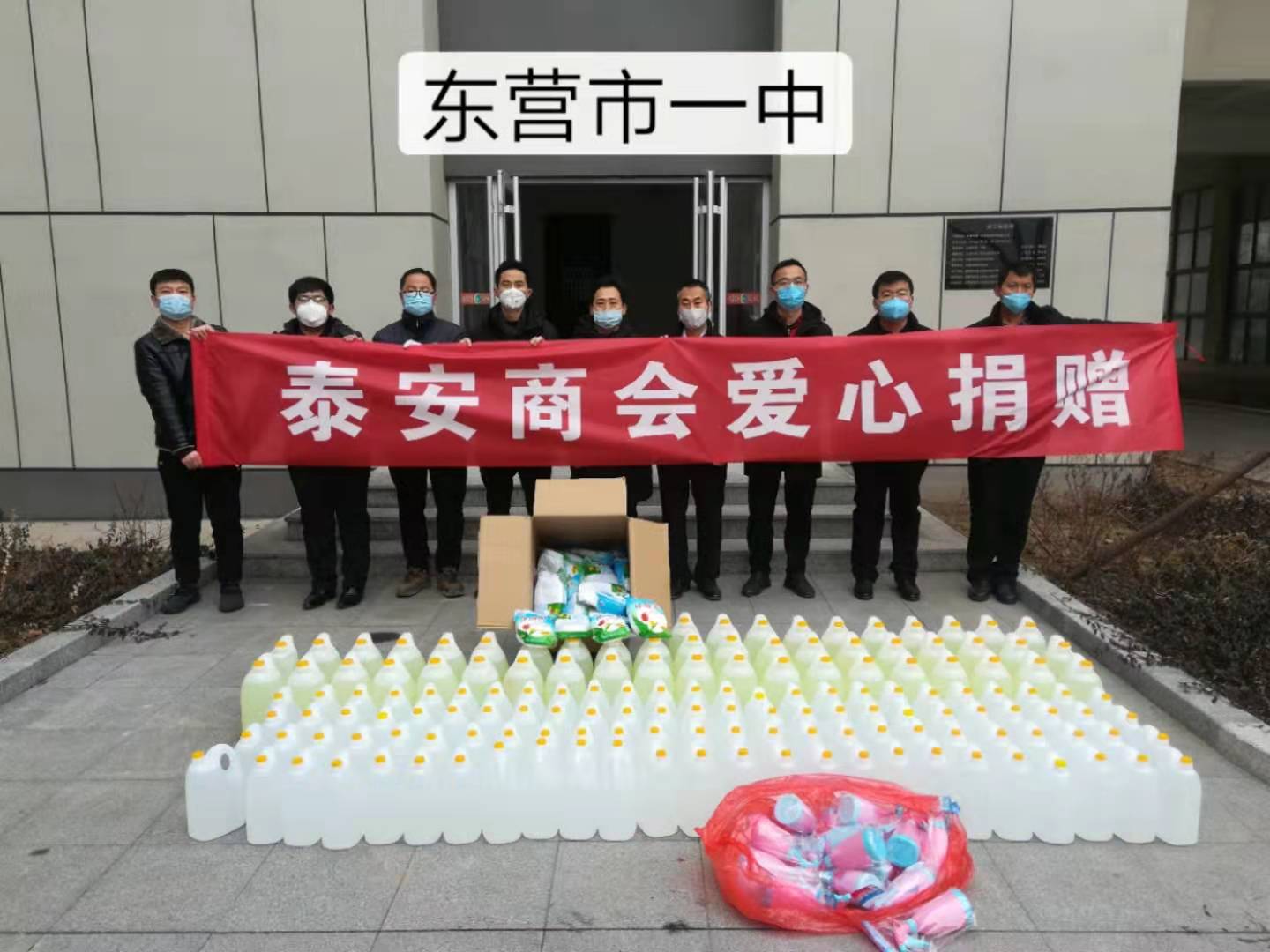 作為東營市泰安商會副會長單位的“山東揚(yáng)石工程檢驗(yàn)檢測有限公司”/副會長歐陽石,協(xié)同東營市金盾司法學(xué)校/會長楊萬里、東營市玉峰幼兒園/商會黨委書記張峰、東營海之聲文化傳媒有限公司/常務(wù)副會長陳乃強(qiáng)、東岳德系名車維修中心/副會長張峰、東營奧樽商貿(mào)有限公司/副會長張培峰、山東銀豐工貿(mào)有限公司/副會長郭延海、及明寶建、趙玉增、史元良、劉洋、顏凱華、陳明兵、和華、王林、史廣國一行,攜帶防疫緊缺物資“酒精、84消毒液、口罩、噴壺”在東營市教育局統(tǒng)一組織下,前往東營市第一中學(xué)、東營市第二中學(xué)、東營市勝利第三中學(xué)走訪捐贈(zèng)。